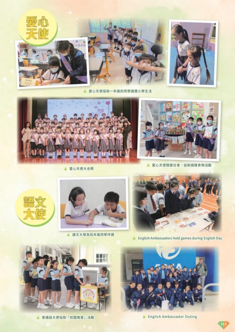 愛心 天使 愛心天使協助一年級的同學適應小學生活 愛心天使關愛社會,協助捐贈食物活動 愛心天使大合照 語文 大使 語文大使為低年級同學伴讀 English Ambassadors hold games during English Day 普通話大使協助「校園推普」活動 English Ambassador Outing 113