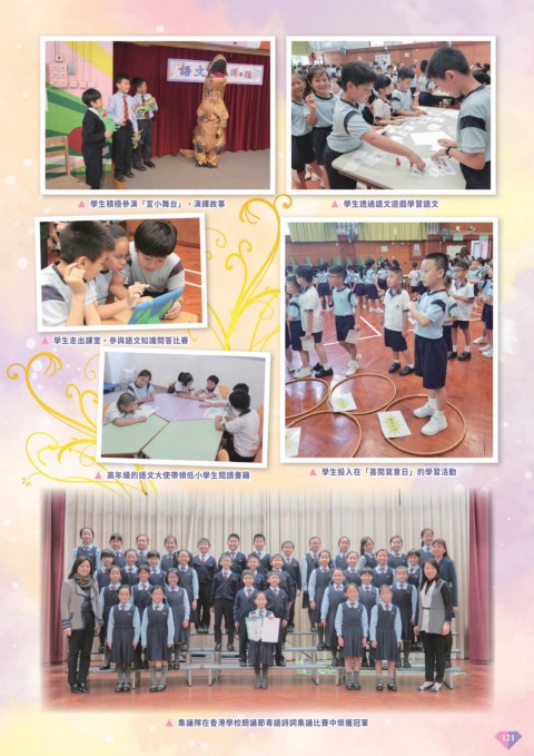學生積極參演「宣小舞台」,演繹故事 學生透過語文遊戲學習語文 學生走出課室,參與語文知識問答比賽 學生投入在「喜閱寫意日」的學習活動 高年級的語文大使帶領低小學生閱讀書籍 集誦隊在香港學校朗誦節粵語詩詞集誦比賽中榮獲冠軍 121