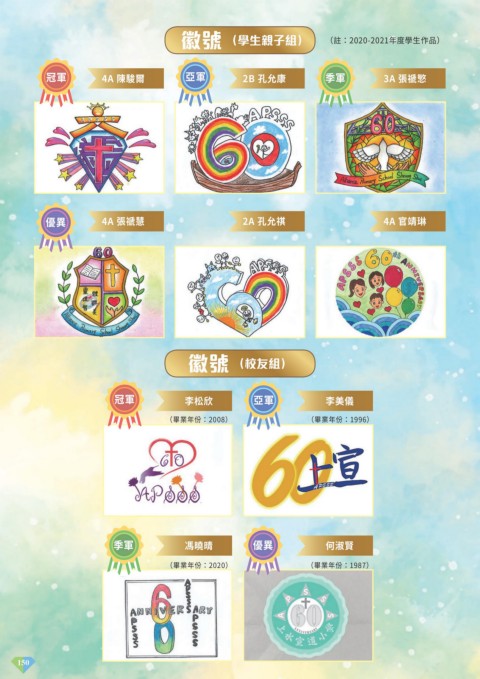 徽號 (學生親子組) (註:2020-2021年度學生作品) 冠軍 4A 陳駿爾 亞軍 2B 孔允康 季軍 3A 張禠慜 優異 4A 張禠慧 2A 孔允祺 4A 官靖琳 徽號 (校友組) 冠軍 李松欣 亞軍 李美儀 (畢業年份:2008) (畢業年份:1996) 季軍 馮曉晴 優異 何淑賢 (畢業年份:2020) (畢業年份:1987) 150