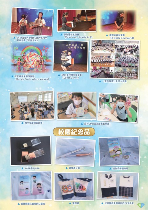 廖珈惠校友演奏 譚傑夫校友演奏 2C譚沚善同學及5C譚天悅同學 《Schubert – Sonata in A》 《A whole new world》 管樂合奏《天空之城》 4A班黃梓棋同學演奏 三年級學生表演舞蹈 《Caber Dance》 《Candy Candy where are you》 《生命有價》全校大合唱 周年校慶問答比賽 設計CD封面及繪畫石頭畫 校慶紀念品 16GB發光USB 鑽禧原子筆 迷你手冊便條貼 設計新穎又實用的口罩夾 環保袋 以校服為主題設計的F4文件夾 161