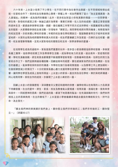 回顧上水宣小的發展歷程,深深體會天父豐足和適時的供應,讓學校得以在有限的人力及資源