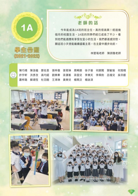 老師的話 1A 今年能成為1A班的班主任,真的很高興!經過幾 個月的校園生活,1A班的同學們經已成長了不少,看 到他們能適應和享受在宣小的生活,我們都甚感欣慰。 願這班小天使能繼續盛載主恩,在主愛中邁步向前。 學生合照 (2021-2022) 林楚瑤老師 陳詩雅老師 陳巧晴 陳洛楹 鄭名恩 張梓傲 張䓪琳 周晞朗 徐子晉 何朗聞 賀敏瑜 何雨晴 許宇軒 洪彥孜 高均諾 劉樂牽 梁灝峯 梁茵兒 李樂天 李舜鈞 呂禧兒 吳宗叡 蕭梓路 蘇靖恆 杜羽翹 王浠琳 黃樂兒 楊珮汶 楊詠淇 75