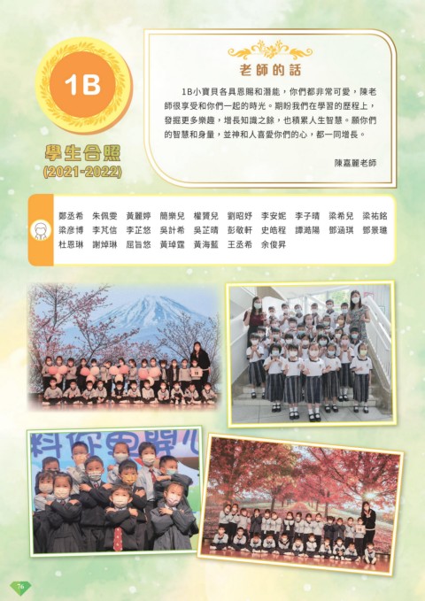 老師的話 1B 1B小寶貝各具恩賜和潛能,你們都非常可愛,陳老 師很享受和你們一起的時光。期盼我們在學習的歷程上, 發掘更多樂趣,增長知識之餘,也積累人生智慧。願你們 的智慧和身量,並神和人喜愛你們的心,都一同增長。 學生合照 (2021-2022) 陳嘉麗老師 鄭丞希 朱佩雯 黃麗婷 簡樂兒 權贇兒 劉昭妤 李安妮 李子晴 梁希兒 梁祐銘 梁彦博 李芃信 李芷悠 吳計希 吳芷晴 彭敬軒 史皓程 譚澔陽 鄧涵琪 鄧景璡 杜恩琳 謝焯琳 屈旨悠 黃琸霆 黃海藍 王丞希 余俊昇 76