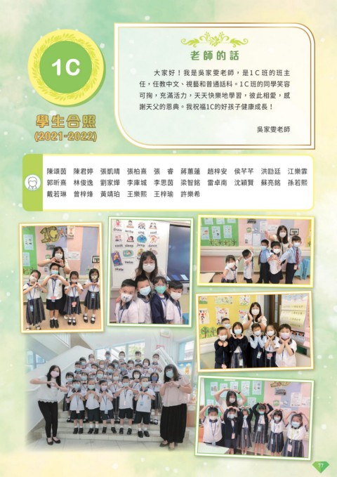 老師的話 1C 大家好!我是吳家雯老師,是1C班的班主 任,任教中文、視藝和普通話科。1C班的同學笑容 可掬,充滿活力,天天快樂地學習,彼此相愛,感 謝天父的恩典。我祝福1C的好孩子健康成長! 學生合照 (2021-2022) 吳家雯老師 陳頌茵 陳君婷 張凱晴 張柏熹 張 睿 蔣蕙蓮 趙梓安 侯芊芊 洪劻廷 江樂霏 郭昕熹 林俊逸 劉家燁 李庫城 李思茵 梁智銘 雷卓南 沈穎賢 蘇亮銘 孫若熙 戴若琳 曾梓烽 黃靖珀 王樂熙 王梓瑜 許樂希 77