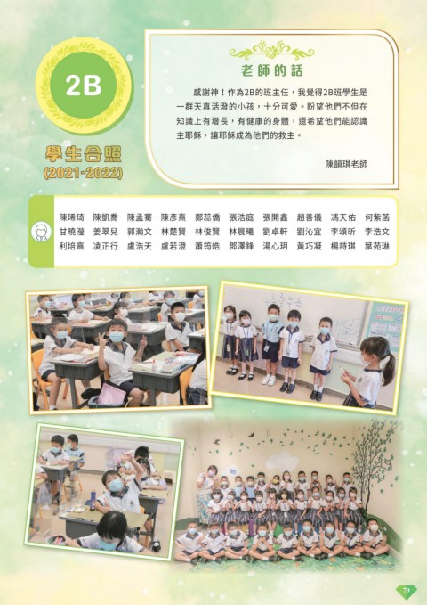 老師的話 2B 感謝神!作為2B的班主任,我覺得2B班學生是 一群天真活潑的小孩,十分可愛。盼望他們不但在 知識上有增長,有健康的身體,還希望他們能認識 主耶穌,讓耶穌成為他們的救主。 學生合照 (2021-2022) 陳韻琪老師 陳琋琦 陳凱喬 陳孟騫 陳彥熹 鄭蕊僑 張浩庭 張開鑫 趙善儀 馮天佑 何紫菡 甘曉瀅 姜翠兒 郭瀚文 林楚賢 林俊賢 林晨曦 劉卓軒 劉沁宜 李頌昕 李浩文 利培熹 凌正行 盧浩天 盧若澄 蕭筠皓 鄧澤鋒 湯心玥 黃巧凝 楊詩琪 葉苑琳 79