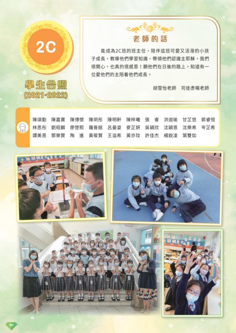 老師的話 2C 能成為2C班的班主任,陪伴這班可愛又活潑的小孩 子成長,教導他們學習知識,帶領他們認識主耶穌,我們 很開心,也真的很感恩!願他們在日後的路上,知道有一 位愛他們的主陪着他們成長。 學生合照 (2021-2022) 胡雪怡老師 司徒彥暘老師 陳頌勤 陳嘉寶 陳博懷 陳玥彤 陳明軒 陳梓曦 張 睿 洪迦瑜 甘芷悠 郭睿恒 林思彤 劉昭麟 廖啓熙 羅善銘 呂曼姿 麥芷妍 吳穎欣 沈穎恩 沈樂希 岑芷希 譚美恩 鄧樂賢 陶 進 黃敬賢 王溢希 黃亦玟 許佳杰 楊銳凌 葉雙如 80