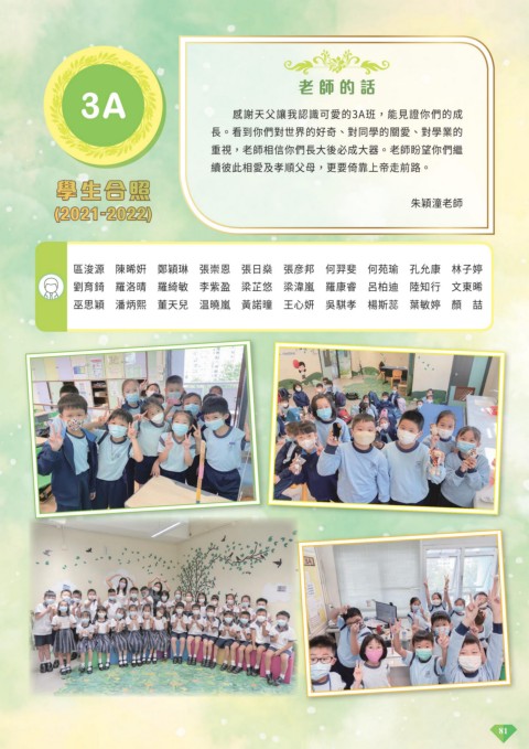 老師的話 3A 感謝天父讓我認識可愛的3A班,能見證你們的成 長。看到你們對世界的好奇、對同學的關愛、對學業的 重視,老師相信你們長大後必成大器。老師盼望你們繼 續彼此相愛及孝順父母,更要倚靠上帝走前路。 學生合照 (2021-2022) 朱穎潼老師 區浚源 陳晞姸 鄭穎琳 張崇恩 張日燊 張彦邦 何羿斐 何苑瑜 孔允康 林子婷 劉育錡 羅洛晴 羅綺敏 李紫盈 梁芷悠 梁湋嵐 羅康睿 呂柏迪 陸知行 文東晞 巫思穎 潘炳熙 董天兒 温曉嵐 黃諾曈 王心妍 吳騏孝 楊斯蕊 葉敏婷 顏 喆 81
