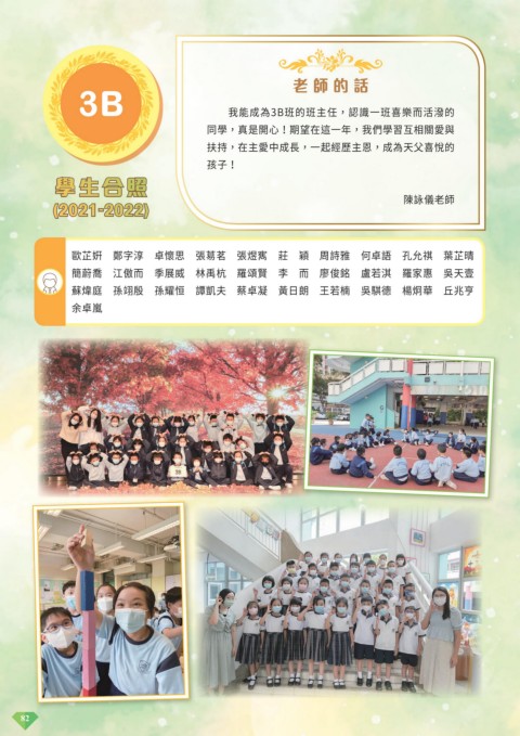 老師的話 3B 我能成為3B班的班主任,認識一班喜樂而活潑的 同學,真是開心!期望在這一年,我們學習互相關愛與 扶持,在主愛中成長,一起經歷主恩,成為天父喜悅的 孩子! 學生合照 (2021-2022) 陳詠儀老師 歐芷姸 鄭字淳 卓懷思 張䓪茗 張煜寯 莊 穎 周詩雅 何卓語 孔允祺 葉芷晴 簡蔚喬 江傲而 季展威 林禹杭 羅頌賢 李 而 廖俊銘 盧若淇 羅家惠 吳天壹 蘇煒庭 孫翊殷 孫耀恒 譚凱夫 蔡卓凝 黃日朗 王若楠 吳騏德 楊炯華 丘兆亨 余卓嵐 82