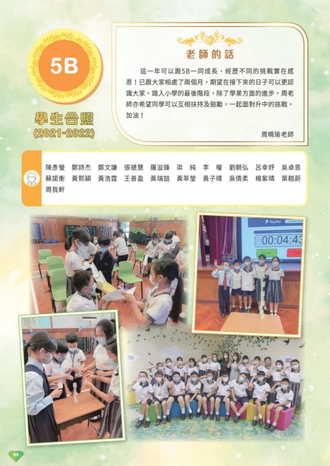 老師的話 5B 這一年可以跟5B一同成長、經歷不同的挑戰實在感 恩!已跟大家相處了兩個月,期望在接下來的日子可以更認 識大家。踏入小學的最後階段,除了學業方面的進步,周老 師亦希望同學可以互相扶持及鼓勵,一起面對升中的挑戰。 學生合照 加油! (2021-2022) 周曉瑜老師 陳彥螢 鄭詩杰 鄭文謙 張禠慧 羅溢鋒 梁 純 李 權 劉朝弘 呂幸妤 吳卓恩 蘇諾衡 黃熙穎 黃浩霆 王善盈 黃瑞喆 黃萃瑩 黃子晴 吳倩柔 楊紫晴 葉翹蔚 周我軒 88