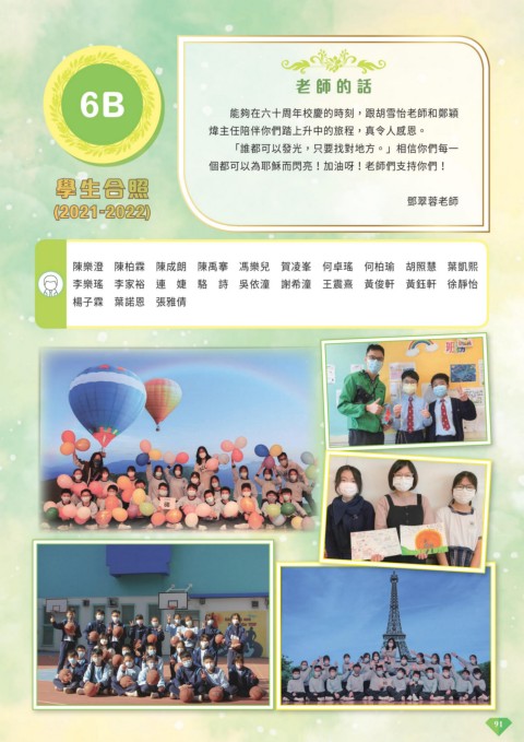 老師的話 6B 能夠在六十周年校慶的時刻,跟胡雪怡老師和鄭穎 煒主任陪伴你們踏上升中的旅程,真令人感恩。 「誰都可以發光,只要找對地方。」相信你們每一 個都可以為耶穌而閃亮!加油呀!老師們支持你們! 學生合照 (2021-2022) 鄧翠蓉老師 陳樂澄 陳柏霖 陳成朗 陳禹搴 馮樂兒 賀凌峯 何卓瑤 何柏瑜 胡照慧 葉凱熙 李樂瑤 李家裕 連 婕 駱 詩 吳依潼 謝希潼 王震熹 黃俊軒 黃鈺軒 徐靜怡 楊子霖 葉諾恩 張雅倩 91