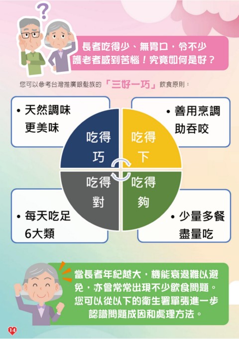 長者吃得少、無胃口,令不少 護老者感到苦惱!究竟如何是好? 您可以參考台灣推廣銀髮族的「三好一巧」飲食原則: 當長者年紀越大,機能衰退難以避 免,亦會常常出現不少飲食問題。 您可以從以下的衛生署單張進一步 認識問題成因和處理方法。 14