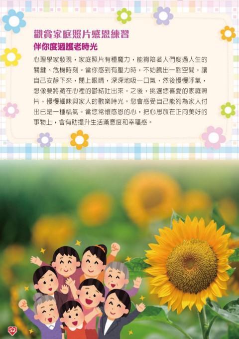 觀賞家庭照片感恩練習 觀賞家庭照片感恩練習 伴你度過護老時光 心理學家發現,家庭照片有種魔力,能夠陪著人們度過人生的 關鍵、危機時刻。當你感到有壓力時,不妨騰出一點空間,讓 自己安靜下來,閉上眼睛,深深地吸一口氣,然後慢慢呼氣, 想像要將藏在心裡的鬱結吐出來。之後,挑選您喜愛的家庭照 片,慢慢細味與家人的歡樂時光。您會感受自己能夠為家人付 出已是一種福氣。當您常懷感恩的心,把心思放在正向美好的 事物上,會有助提升生活滿意度和幸福感。 52