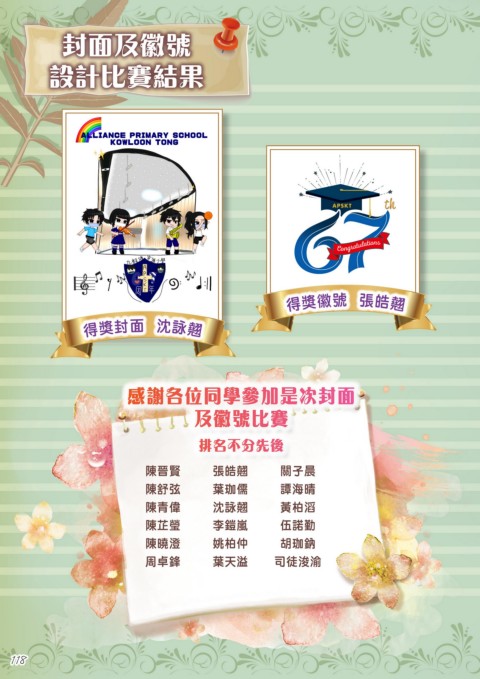 封面及徽號 設計比賽結果 得獎徽號 張皓翹 得獎封面 沈詠翹 感謝各位同學參加是次封面 及徽號比賽 排名不分先後 陳晉賢 張皓翹 關子晨 陳舒弦 葉珈儒 譚海晴 陳青偉 沈詠翹 黃柏滔 陳芷瑩 李鎧嵐 伍諾勤 陳曉澄 姚柏仲 胡珈鈉 周卓鋒 葉天溢 司徒浚渝 118 118