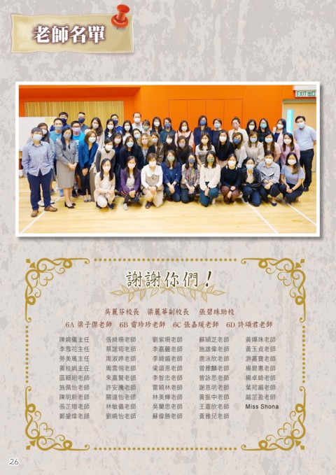 6A 梁子傑老師 6B 雷珍珍老師 6C 張嘉瑗老師 6D 許頌君老師