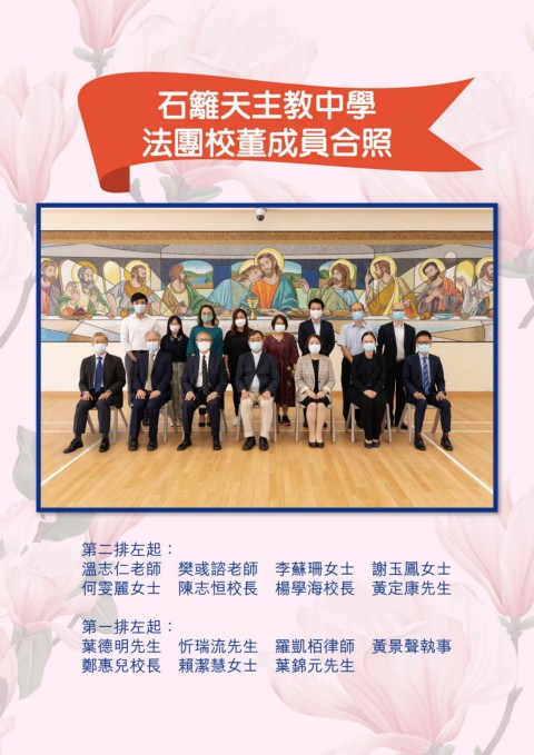 石籬天主教中學 法團校董成員合照 第二排左起: 溫志仁老師 樊彧諮老師 李蘇珊女士 謝玉鳳女士 何雯麗女士 陳志恒校長 楊學海校長 黃定康先生 第一排左起: 葉德明先生 忻瑞流先生 羅凱栢律師 黃景聲執事 鄭惠兒校長 賴潔慧女士 葉錦元先生