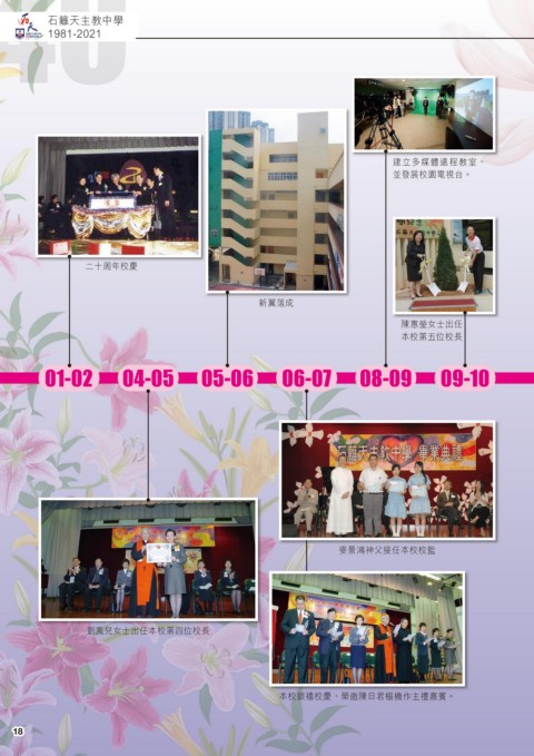 40 石籬天主教中學 1981-2021 石籬天主教中學 40周年校慶 1 981 - 2021 建立多媒體遠程教室, 並發展校園電視台。 二十周年校慶 新翼落成 陳惠瑩女士出任 本校第五位校長 01-02 04-05 05-06 06-07 08-09 09-10 麥景鴻神父接任本校校監 劉鳳兒女士出任本校第四位校長 本校銀禧校慶,榮邀陳日君樞機作主禮嘉賓。 18 18