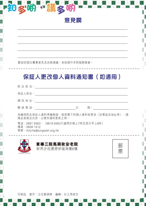 為確保院友保証人資料準確無誤,倘若閣下的個人資料有更改(如電話及地址等),請