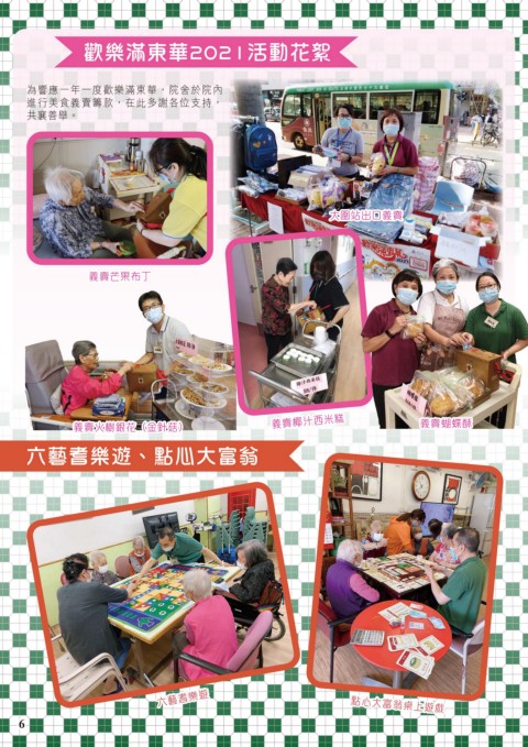 歡樂滿東華2021活動花絮 為響應一年一度歡樂滿東華,院舍於院內 進行美食義賣籌款,在此多謝各位支持, 共襄善舉。 大圍站出口義賣 大圍站出口義賣 義賣芒果布丁 義賣芒果布丁 義賣椰汁西米糕 義賣蝴蝶酥 義賣椰汁西米糕 義賣蝴蝶酥 義賣火樹銀花(金針菇) 義賣火樹銀花 ( 金針菇 ) 六藝耆樂遊、點心大富翁 六藝耆樂遊 點心大富翁桌上遊戲 六藝耆樂遊 點心大富翁桌上遊戲 6 6