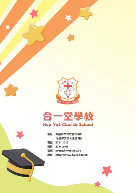 合一堂學校 合一 堂學校 Hop Yat Church School Hop Yat Church School 地址:九龍何文田巴富街6號 九龍何文田公主道7號 電話:2711 1013 傳真:2714 2465 電郵:hycsa@hycs.edu.hk 網址:http://www.hycs.edu.hk 第六十二屆 第六十二屆