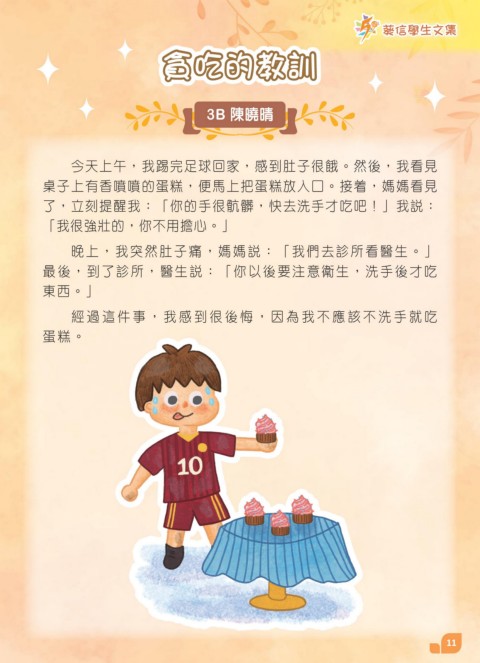葵信學生文集 貪吃的教訓 3B 陳曉晴 今天上午,我踢完足球回家,感到肚子很餓。然後,我看見 桌子上有香噴噴的蛋糕,便馬上把蛋糕放入口。接着,媽媽看見 了,立刻提醒我:「你的手很骯髒,快去洗手才吃吧!」我說: 「我很強壯的,你不用擔心。」 晚上,我突然肚子痛,媽媽說:「我們去診所看醫生。」 最後,到了診所,醫生說:「你以後要注意衞生,洗手後才吃 東西。」 經過這件事,我感到很後悔,因為我不應該不洗手就吃 蛋糕。 11
