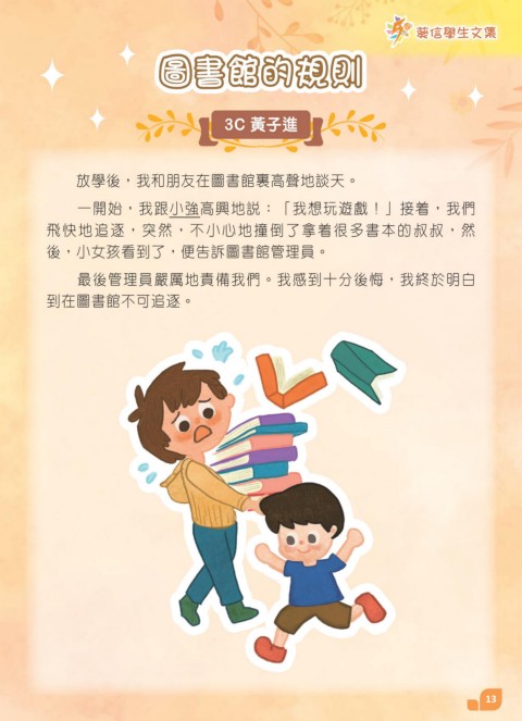 葵信學生文集 圖書館的規則 3C 黃子進 放學後,我和朋友在圖書館裏高聲地談天。 一開始,我跟小強高興地說:「我想玩遊戲!」接着,我們 飛快地追逐,突然,不小心地撞倒了拿着很多書本的叔叔,然 後,小女孩看到了,便告訴圖書館管理員。 最後管理員嚴厲地責備我們。我感到十分後悔,我終於明白 到在圖書館不可追逐。 13