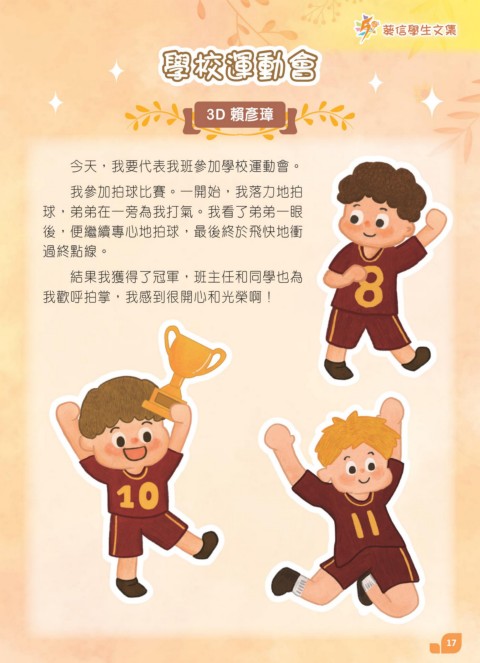 葵信學生文集 學校運動會 3D 賴彥璋 今天,我要代表我班參加學校運動會。 我參加拍球比賽。一開始,我落力地拍 球,弟弟在一旁為我打氣。我看了弟弟一眼 後,便繼續專心地拍球,最後終於飛快地衝 過終點線。 結果我獲得了冠軍,班主任和同學也為 我歡呼拍掌,我感到很開心和光榮啊! 17