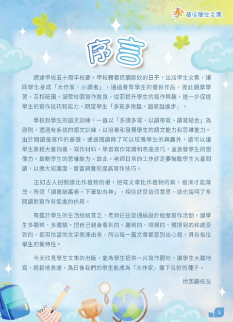 適逢學校五十周年校慶,學校藉着這個歡欣的日子,出版學生文集,讓