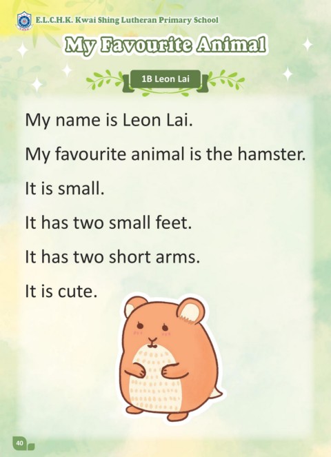 E.L.C.H.K. Kwai Shing Lutheran Primary School My Favourite Animal 1B Leon Lai My name is Leon Lai. My favourite animal is the hamster. It is small. It has two small feet. It has two short arms. It is cute. 40