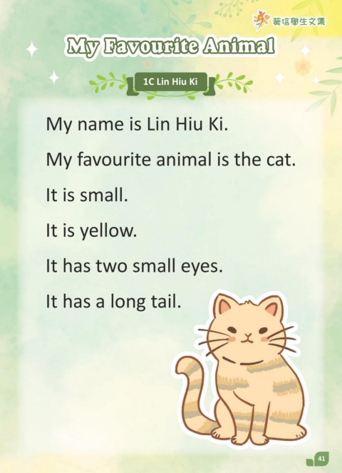 葵信學生文集 My Favourite Animal 1C Lin Hiu Ki My name is Lin Hiu Ki. My favourite animal is the cat. It is small. It is yellow. It has two small eyes. It has a long tail. 41