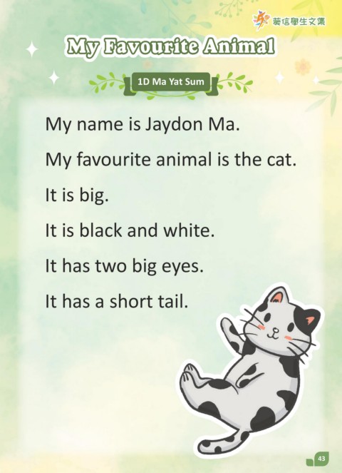 葵信學生文集 My Favourite Animal 1D Ma Yat Sum My name is Jaydon Ma. My favourite animal is the cat. It is big. It is black and white. It has two big eyes. It has a short tail. 43