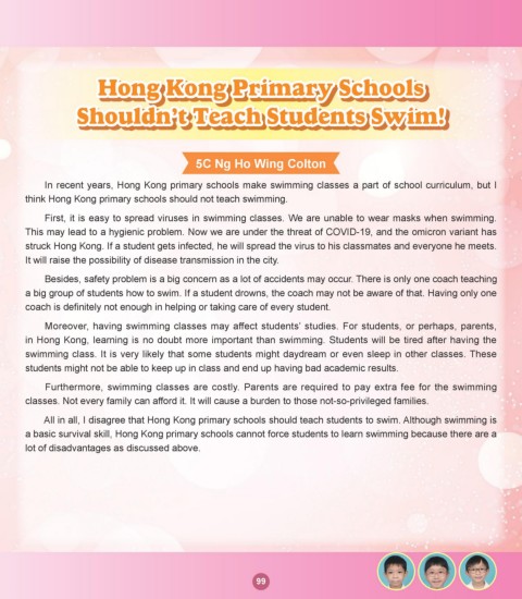 All in all, I disagree that Hong Kong primary schools should teach students to swim. Although swimming is
