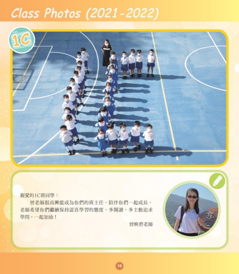 Class Photos (2021-2022) 1C 親愛的1C班同學: 曾老師很高興能成為你們的班主任,陪伴你們一起成長。 老師希望你們繼續保持認真學習的態度,多閱讀,多主動追求 學問。一起加油! 曾映碧老師 10