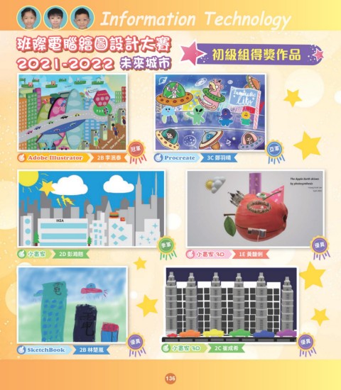 Information Technology 班際電腦繪圖設計大賽 初級組得獎作品 2021-2022 未來城市 冠軍 亞軍 Adobe Illustrator 2B 李泯泰 Procreate 3C 鄭羽晴 季軍 優異 小畫家 2D 彭澔翹 小畫家 3D 1E 黃馥俐 優異 優異 SketchBook 2B 林楚嵐 小畫家 3D 2C 崔成希 136