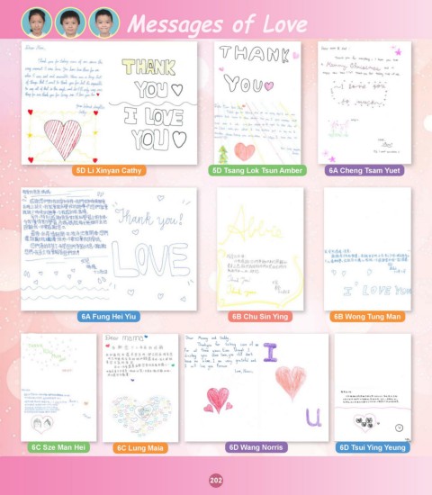 Messages of Love 5D Li Xinyan Cathy 5D Tsang Lok Tsun Amber 6A Cheng Tsam Yuet 6A Fung Hei Yiu 6B Chu Sin Ying 6B Wong Tung Man 6C Sze Man Hei 6C Lung Maia 6D Wang Norris 6D Tsui Ying Yeung 202