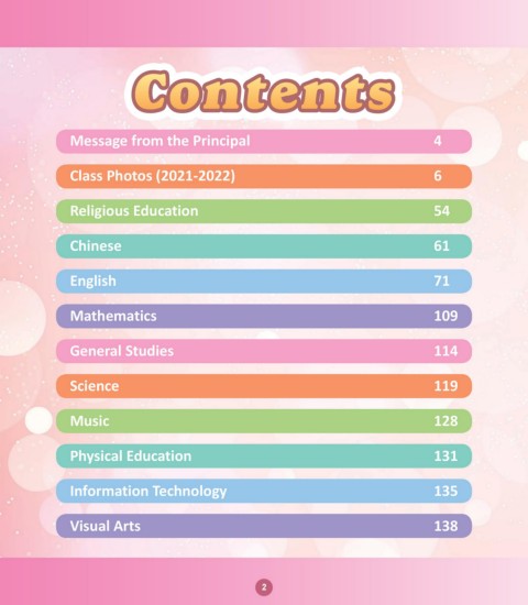 Contents Message from the Principal 4 Class Photos (2021-2022) 6 Religious Education 54 Chinese 61 English 71 Mathematics 109 General Studies 114 Science 119 Music 128 Physical Education 131 Information Technology 135 Visual Arts 138 2