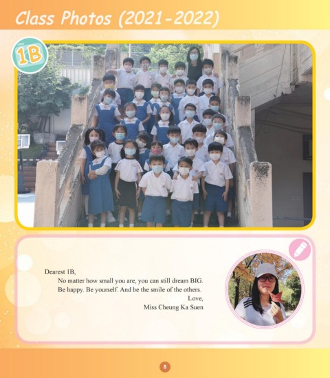 Class Photos (2021-2022) 1B Dearest 1B, No matter how small you are, you can still dream BIG. Be happy. Be yourself. And be the smile of the others. Love, Miss Cheung Ka Suen 8