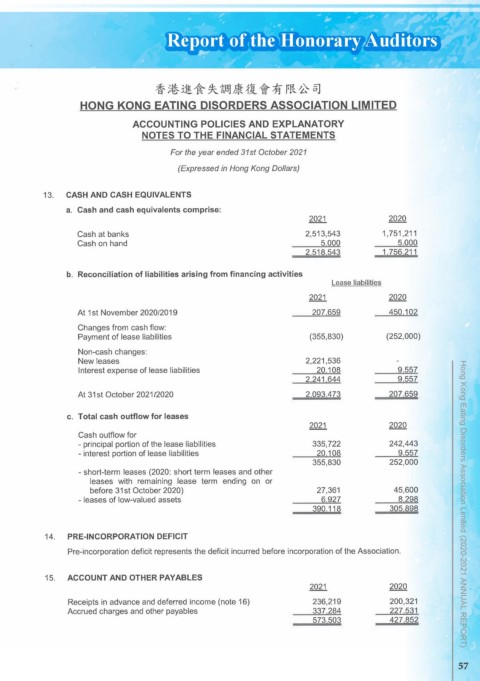 Report of the Honorary Auditors Hong Kong Eating Disorders Association Limited (2020-2021 ANNUAL REPORT) 57