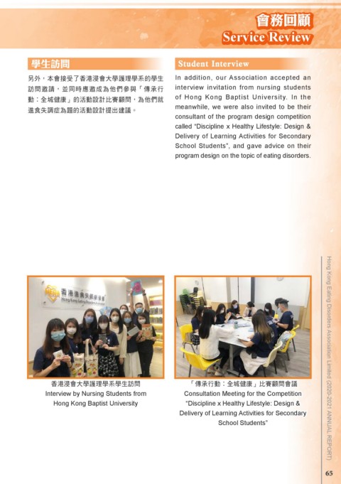 香港浸會大學護理學系學生訪問 「傳承行動︰全城健康」比賽顧問會議 Hong Kong Eating Disorders Association Limited (2020-2021 ANNUAL REPORT)