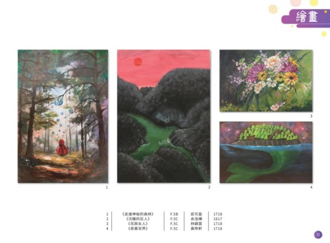 繪畫 3 1 2 4 1 《走進神秘的森林》 F.5B 莊可盈 1718 2 《沉睡的巨人》 F.5C 余浩樺 1617 3 《花與女人》 F.5C 林穎茵 1718 4 《奇異世界》 F.5C 黃梓軒 1718 13