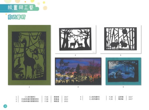 版畫與工藝 剪紙藝術 2 3 1 4 5 1 《入夜的叢林》 F.3A 鄭婉晴 1617 4 《入夜的叢林》 F.3B 孟君儀 1617 2 《在森林裏的雙雙對對》 F.3B 唐嘉遙 2021 5 《入夜的叢林》 F.3D 陳詩敏 1617 3 《在森林裏的雙雙對對》 F.3B 陳凱意 2021 30