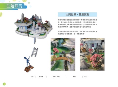 主題探究 大同世界.望塵莫及 每個人都會有他們追求的理想世界。那個世界可能是如桃花源 般,風光如畫,男耕女作,與世無爭;也可能是個科技發達, 再無病痛死亡,也無離別悲傷的地方……,但理想世界始終只 是個幻想的世界,是生命旅途最終也不能到達的終點。 作品懸吊起來,仿如天空之城,人們可望而不可及,而作品會 隨風轉動,有著動態美,是一件動態雕塑。 F.6C 鄧蕙珊 主題:終點 雕塑 2122 46