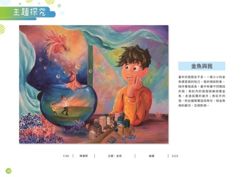 主題探究 金魚與我 童年的我朋友不多,一尾小小的金 魚便是我的知己,我的傾訴對象, 陪伴著我成長。畫中有著不同階段 的我:魚缸內的兩個我擁抱著金 魚,走過孤獨的歲月;魚缸外的 我,則在緬懷著這段時光,與金魚 相約銀河,互相對視。 F.6D 陳肇熙 主題:金魚 繪畫 2122 48