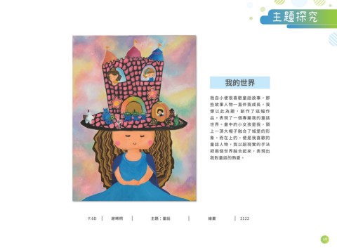 主題探究 我的世界 我自小便很喜歡童話故事,那 些故事人物一直伴我成長,我 便以此為題,創作了這幅作 品,表現了一個專屬我的童話 世界。畫中的小女孩是我,頭 上一頂大帽子融合了城堡的形 象,而在上的,便是我喜歡的 童話人物,我以超現實的手法 把兩個世界融合起來,表現出 我對童話的熱愛。 F.6D 謝晞桐 主題:童話 繪畫 2122 49