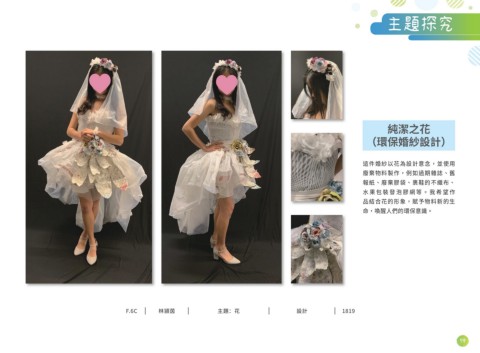 主題探究 純潔之花 (環保婚紗設計) 這件婚紗以花為設計意念,並使用 廢棄物料製作,例如過期雜誌、舊 報紙、廢棄膠袋、裹鞋的不織布、 水果包裝發泡膠網等。我希望作 品結合花的形象,賦予物料新的生 命,喚醒人們的環保意識。 F.6C 林頴茵 主題:花 設計 1819 59