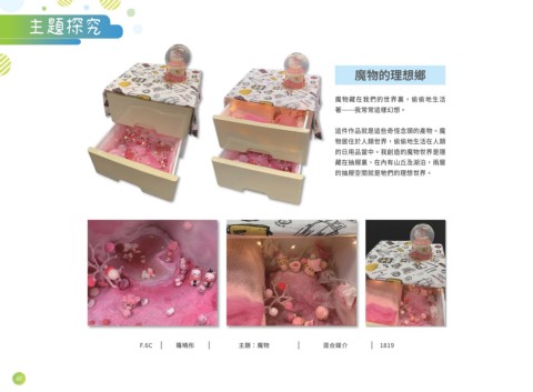 主題探究 魔物的理想鄉 魔物藏在我們的世界裏,偷偷地生活 著 我常常這樣幻想。 這件作品就是這些奇怪念頭的產物。魔 物居住於人類世界,偷偷地生活在人類 的日用品當中。我創造的魔物世界是隱 藏在抽屜裏,在內有山丘及湖泊,兩層 的抽屜空間就是牠們的理想世界。 F.6C 羅曉彤 主題:魔物 混合媒介 1819 60
