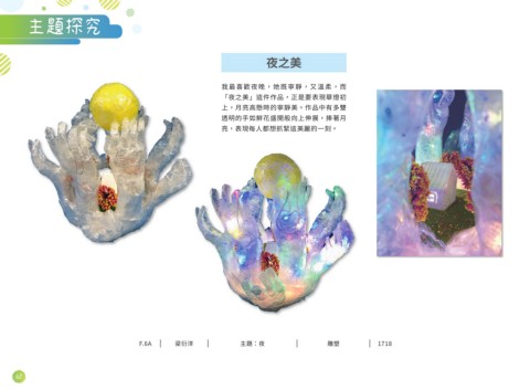 主題探究 夜之美 我最喜歡夜晚,她既寧靜,又溫柔,而 「夜之美」這件作品,正是要表現華燈初 上,月亮高懸時的寧靜美。作品中有多雙 透明的手如鮮花盛開般向上伸展,捧著月 亮,表現每人都想抓緊這美麗的一刻。 F.6A 梁衍洋 主題:夜 雕塑 1718 62