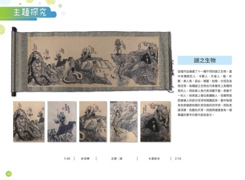 主題探究 謎之生物 這幅作品繪畫了十一種不同的謎之生物,當 中有獨眼巨人、半獸人、外星人、龍、年 獸、美人魚、狐仙、精靈、蛇精、水怪及孫 悟空等。每種謎之生物也代表著世上某種特 質的人,例如美人魚代表深藏不露,表裏不 一的人,她表面上看似美麗動人,但實際是 把最嚇人的部分深深地隱藏起來。畫中每個 角色旁邊都有關於其性格的四字詞,例如老 謀深算、色膽包天等,詞語旁邊還會有一個 專屬的單字印章代表其身分。 F.6B 余浩樺 主題:謎 水墨紙本 1718 64