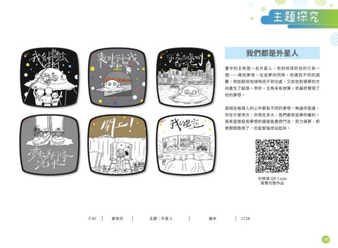 主題探究 我們都是外星人 書中的主角是一名外星人,他到地球的目的只有一 個 尋找夢想。在追夢的同時,他遇到不同的困 難,例如剛到地球時找不到住處,又如他對尋夢的方 向產生了疑惑。幸好,主角未有放棄,他最終實現了 他的夢想。 我相信每個人的心中都有不同的夢想,無論你是誰, 你在什麼地方,你現在多大,我們都有追夢的權利。 我希望曾經有夢想的讀者能重燃鬥志,努力尋夢,即 使期間跌倒了,也能堅強地站起來。 可掃描 QR Code 瀏覽完整作品 F.6C 姜俊任 主題:外星人 繪本 1718 65