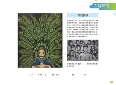 主題探究 非我族類 現今社會,不少人都以不同的目光審視別人,非我 族類便被人歧視,而被歧視者就如怪物般,要接受 著別人不平等的眼光。我選擇用動物園裡的孔雀作 為怪物的形象,因為孔雀開屏時受人注目,而牠的 尾巴有一個個圓形,有著螢光的色彩,就如人的眼 睛般。透過三十隻眼睛如影隨形般跟著怪物身後, 表示被歧視者受到別人的歧視時只能忍耐,而在夜 裏才會流露出心中痛苦的表情。 畫中藍色衣扣是個QR Code,藏有被歧視者遭人 排擠的慘況 F.6C 徐文傑 主題:歧視 繪畫 1617 71