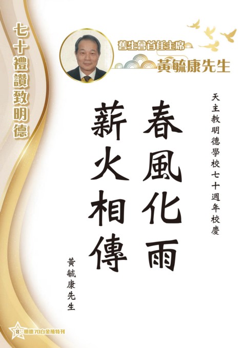 讚 十 禮 德 明 致 七 十 禮 讚 七 德 明 致 舊生會首任主席 舊生會首任主席 黃毓康先生 春風化雨 薪火相傳 黃毓康先生 年 校 校 教 週 十 慶 七 德 明 學 主 天 毓 黃 康 生 先 8 8 明德70白金禧特刊 明德70白金禧特刊